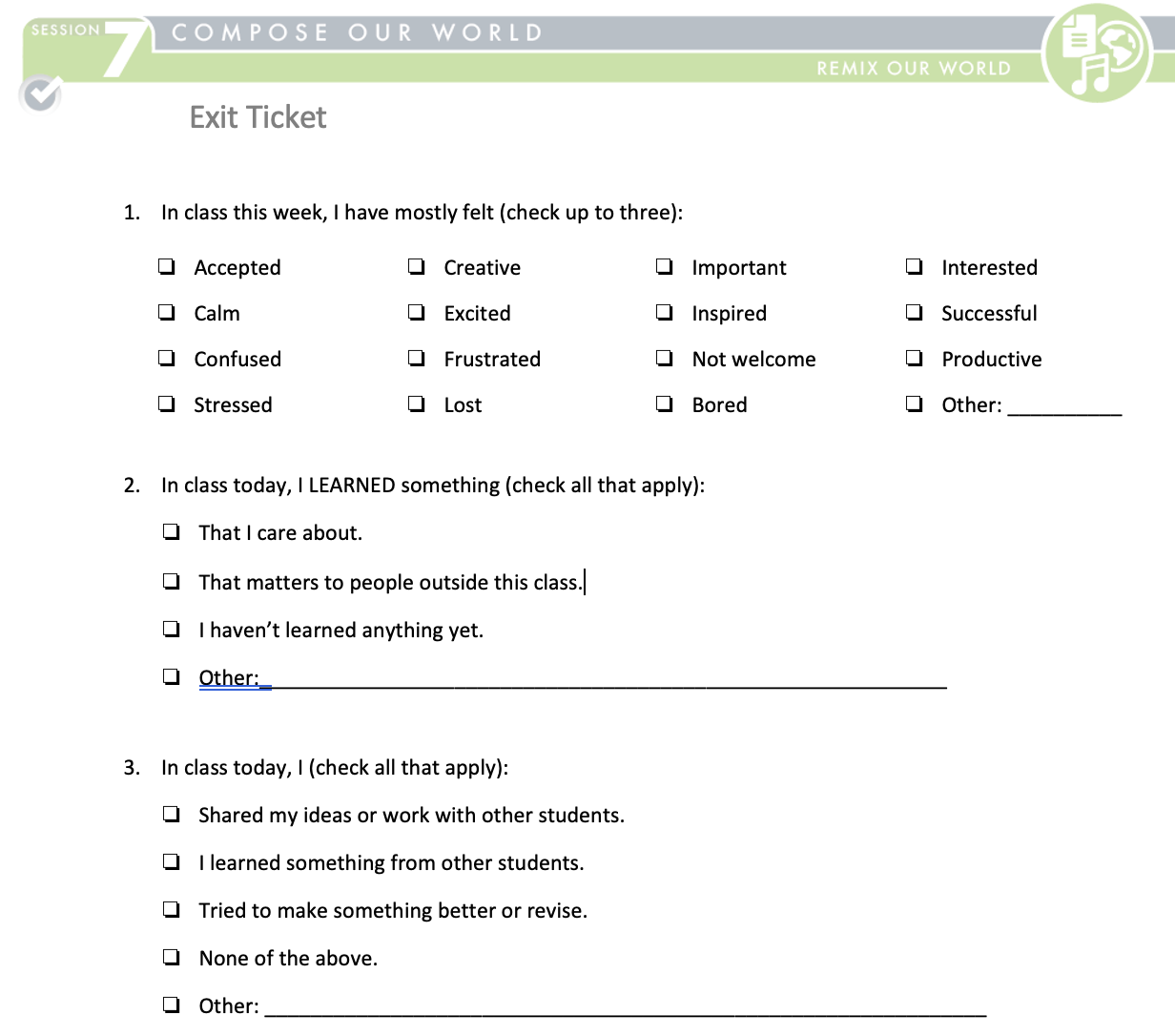 Back to topOne way we can tell is by asking students, regularly and genuinely, and in ways that feel safe to them, to tell us the truth. In our research project, Compose Our World, which explores an approach to project-based learning and language arts, teachers give students social and emotional learning (SEL) exit tickets that ask about their experience in the classroom. This is just one way to integrate SEL with academic instruction, creating engaging, high-quality learning experiences for students.